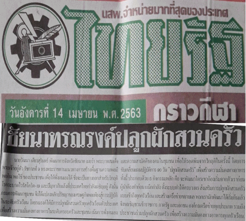ขอเชิญชวนข้าราชการ ภาครัฐ รัฐวิสาหกิจ ภาคเอกชน ภาคประชาสังคม ผู้นำท้องถิ่น ท้องที่ ผู้นำกลุ่ม องค์กรเครือข่ายทุกประเภท รวมถึงประชาชนร่วมปลูกผักสวนครัว เพื่อสร้างความมั่นคงทางอาหาร ทุกครัวเรือน รณรงค์ให้มีการปลูกผักสวนครัวทุกครัวเรือนทั่วประเทศ เพื่อสร้างความมั่นคงทางอาหารในระดับครอบครัวและชุมชน โดยเน้นการพึ่งตนเอง และความสามัคคีของคนในชุมชน เพื่อให้รอดพ้นจากวิกฤตในครั้งนี้ โดยการขับเคลื่อนแผนปฏิบัติการ 90 วัน “ปลูกผักสวนครัว” เพื่อสร้างความมั่นคงทางอาหาร” ดำเนินการกิจกรรมที่ 1 “จะพัฒนาใครเขาต้องเริ่มจากตัวเราก่อน” วันที่ 8 เมษายน 2563 ณ บ้านพักพัฒนาการจังหวัดชัยนาท เวลา 16.00 น.