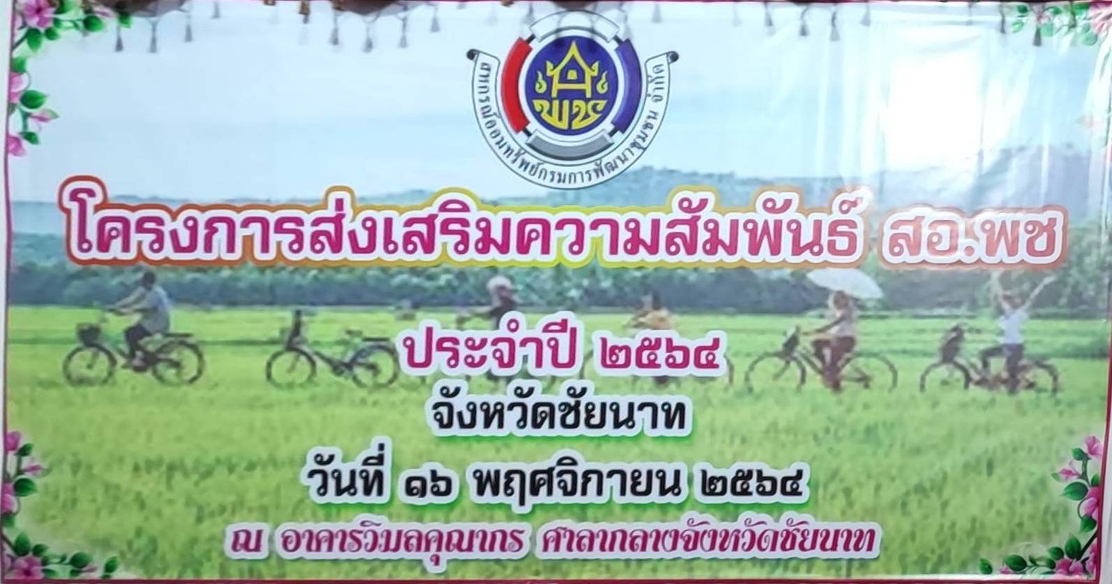 สำนักงานพัฒนาชุมชนจังหวัดชัยนาทจัดกิจกรรมดำเนินโครงการส่งเสริมความสัมพันธ์ สอ.พช.ประจำปี ๒๕๖๔ ณ ห้องประชุมอาคารวิมลคุณากร ด้านข้างศาลากลางจังหวัดชัยนาท โดยมีสมาชิกสหกรณ์ออมทรัพย์กรมการพัฒนาชุมชนจังหวัดชัยนาท และคณะทำงานขับเคลื่อนโครงการเข้าร่วมประชุม เพื่อฟังแนวทางของโครงการและคัดเลือกคณะกรรมการบริหารกลุ่มมีการคัดเลือกผู้แทนสมาชิก ผลการคัดเลือกได้แก่ นางพรรณี พุ่มสุข พัฒนาการอำเภอวัดสิงห์ ได้รับฉันทามติเป็นผู้แทนสมาชิก และมอบสิ่งของอุปโภค บริโภคแก่ครัวเรือนยากไร้ผ่านพัฒนาการอำเภอทั้ง ๘ อำเภอ จำนวน ๑๖ ชุด มอบต้นกล้ามะตูม (ไม้ประจำจังหวัดชัยนาท) ให้ครัวเรือนโคกหนองนา จำนวน ๒๗๑ แปลงผ่านพัฒนาการอำเภอ