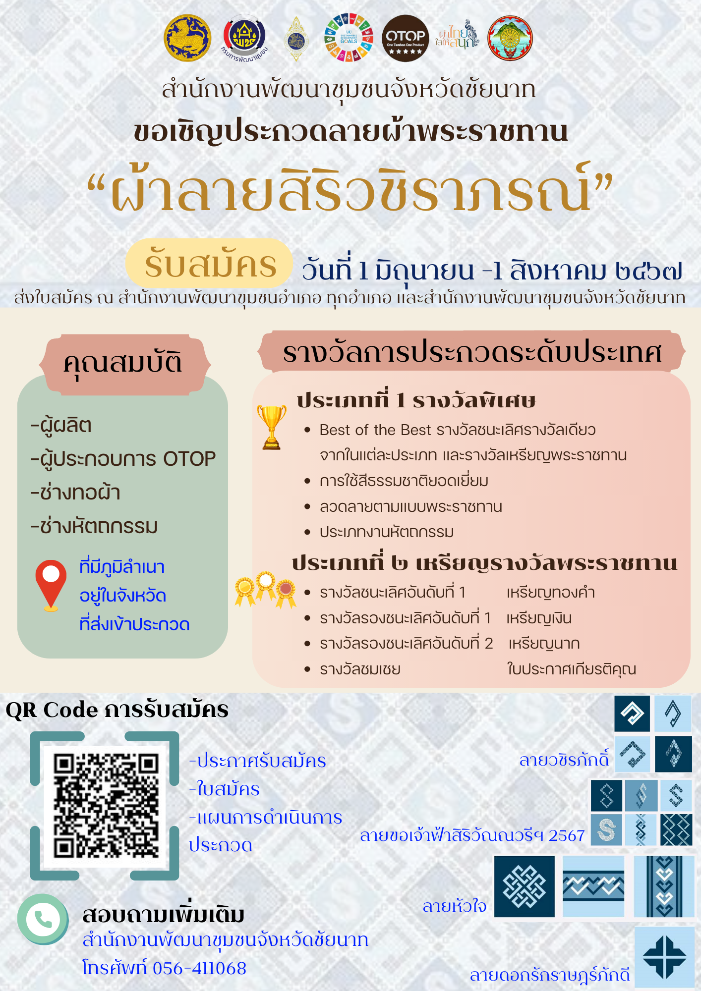📌พช.ชัยนาท ขอเชิญประกวดลายผ้าพระราชทาน “ผ้าลายสิริวชิราภรณ์”  โดยรับสมัคร ตั้งแต่วันที่ 1 มิถุนายน -1 สิงหาคม 2567 สามารถส่งใบสมัคร ณ สำนักงานพัฒนาขุมชนอำเภอ ทุกอำเภอ และสำนักงานพัฒนาชุมขนจังหวัดชัยนาท