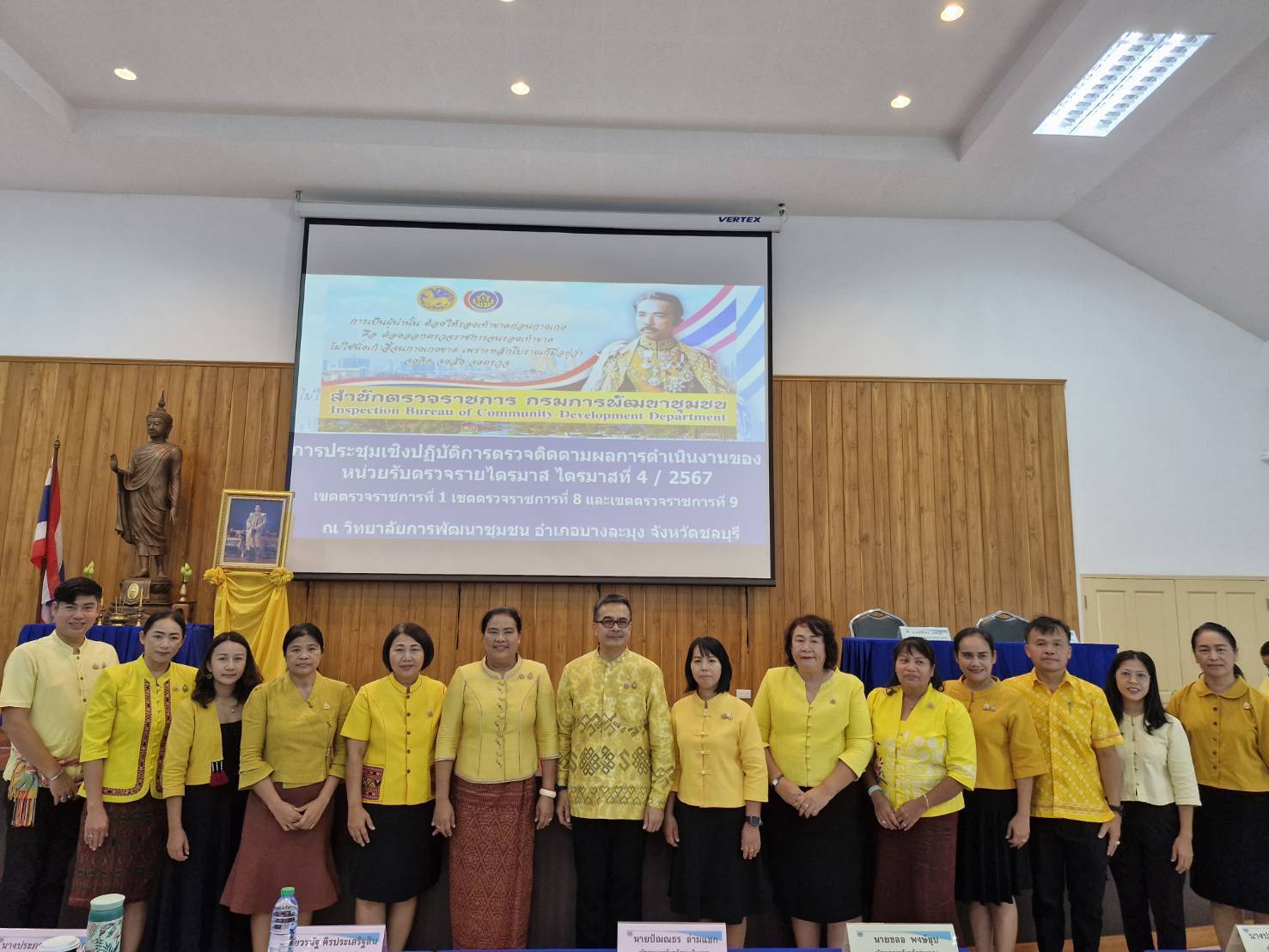 เขตตรวจราชการที่ 1 กลุ่มจังหวัดภาคกลางตอนบน ประกอบด้วย จังหวัดชัยนาทพระนครศรีอยุธยา ลพบุรีสระบุรี สิงห์บุรี อ่างทอง เขตตรวจราชการที่ 8 กลุ่มจังหวัดภาคตะวันออก ประกอบด้วยจังหวัดฉะเชิงเทรา ชลบุรี ระยอง พร้อมด้วยนางอรุณรัตน์ ชิงชนะ ผู้ตรวจราชการกรม เขตตรวจราชการที่ 9 กลุ่มจังหวัดภาคตะวันออก 2 ประกอบด้วย จังหวัดจันทบุรี ตราด นครนายก ปราจีนบุรี สระแก้ว ร่วมลงพื้นที่ติดตามผลการดำเนินงานของหน่วยรับตรวจรายไตรมาส ไตรมาส 4 ที่จัดขึ้นระหว่างวันที่ 10 -11 กันยายน พ.ศ. 2567 ณ วิทยาลัยการพัฒนาชุมชน อำเภอบางละมุง จังหวัดชลบุรี โดยการประชุม ฯ ครั้งนี้ มีวัตถุประสงค์เพื่อตรวจติดตามผลการดำเนินงานของหน่วยรับตรวจให้สามารถขับเคลื่อนงานตามนโยบายรัฐบาล กระทรวงมหาดไทย กรมการพัฒนาชุมชน และงานอื่น ๆ ที่ได้รับมอบหมายให้บรรลุเป้าหมาย เกิดความคุ้มค่าในการปฏิบัติราชการ เป็นไปตามหลักการบริหารกิจการบ้านเมืองที่ดี โดยมีกลุ่มเป้าหมาย ประกอบด้วย พัฒนาการจังหวัด ผู้อำนวยการกลุ่มงาน และพัฒนาการอำเภอ ในพื้นที่เขตตรวจราชการที่ 1 และ 8 โดยคาดหวังว่าผู้เข้าร่วมประชุม ฯ จะสามารถนำแนวทางการบริหารไปสู่การขับเคลื่อนกิจกรรมพัฒนาชุมชนให้บรรลุเป้าหมาย ตามนโยบายของรัฐบาล และยุทธศาสตร์กรมการพัฒนาชุมชน เพื่อก่อให้เกิดความเข้มแข็งของชุมชน และความสุขของประชาชน ในโอกาสต่อไป