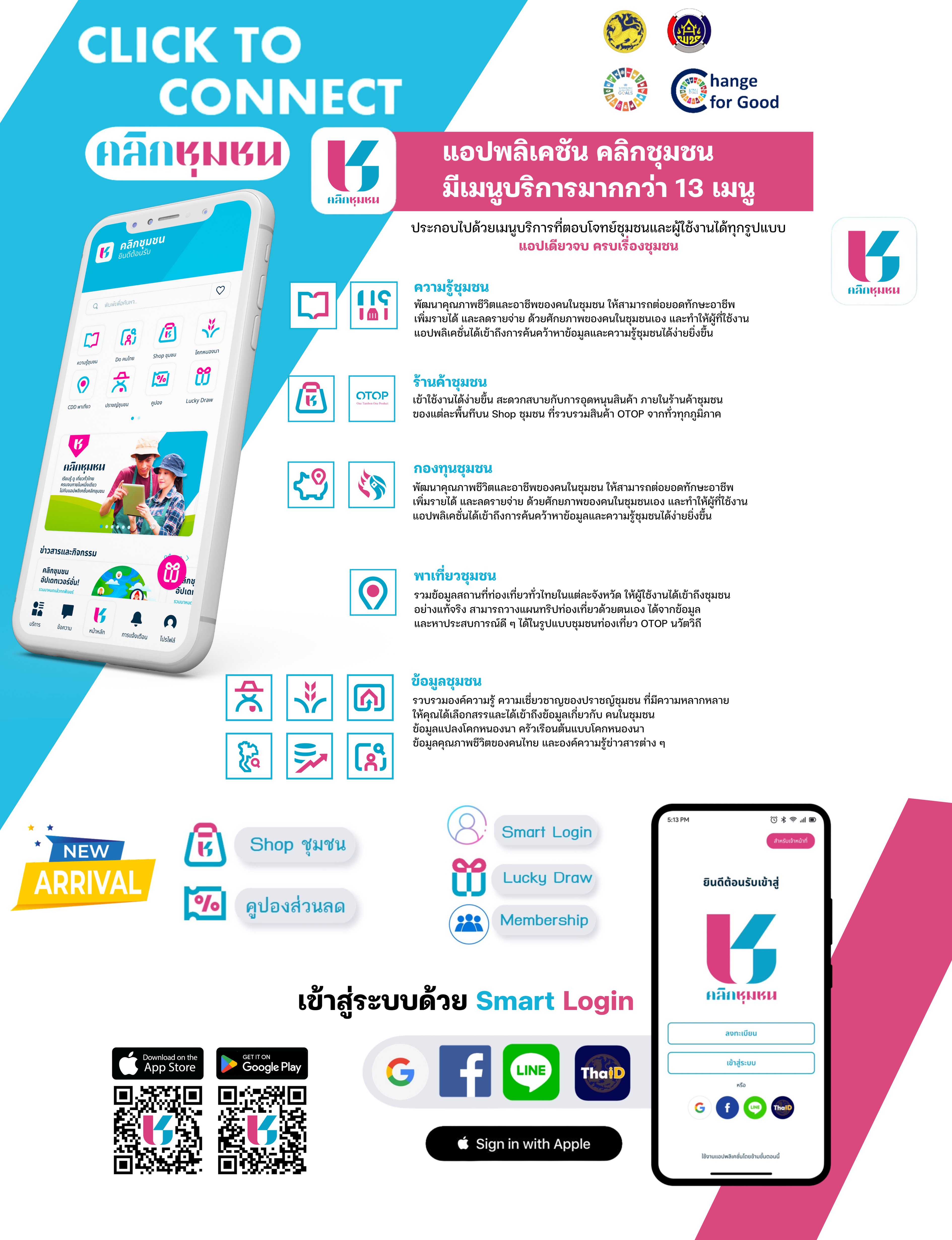 >>ด้วยกรมการพัฒนาชุมชน ได้พัฒนาระบบบริหารจัดการฐานข้อมูลขนาดใหญ่ Big Data กรมการพัฒนาชุมชน ให้สามารถบูรณาการเชื่อมโยงฐานข้อมูลงานพัฒนาชุมชนภายในหน่วยงาน และรองรับ ข้อมูลสำคัญของส่วนราชการอื่น ๆ ตลอดจนข้อมูลสาธารณะต่าง ๆ เพื่อใช้ในการบริหารจัดการตามภารกิจ และยกระดับการให้บริการประชาชนให้เกิดความสะดวกรวดเร็วต่อการเข้าถึงข้อมูลงานพัฒนาชุมชน เพื่อเป็นการพัฒนาต่อยอดระบบ Big Data กรมการพัฒนาชุมชน จึงได้พัฒนาแพลตฟอร์มบริการ ดิจิทัล Click ชุมชน “เรียนรู้ดู เทียว ทั่วไทย” โดยมีวัตถุประสงค์เพื่อใช้ประโยชน์ในการวางแผนพัฒนา คุณภาพชีวิต กระตุ้นเศรษฐกิจชุมชน สร้างอาชีพ สร้างรายได้ เพิ่มความรู้ และส่งเสริมความเป็นอยู่ที่ดี ของประชาชน โดยยกระดับคุณภาพบริการ “Click ชุมชน” ให้เป็นแพลตฟอร์มบริการดิจิทัลแบบครบวงจร (One Stop Service) ประกอบด้วย 13 เมนูบริการ ได้แก่ 1) Shop ชุมชน 2) OTOP Today