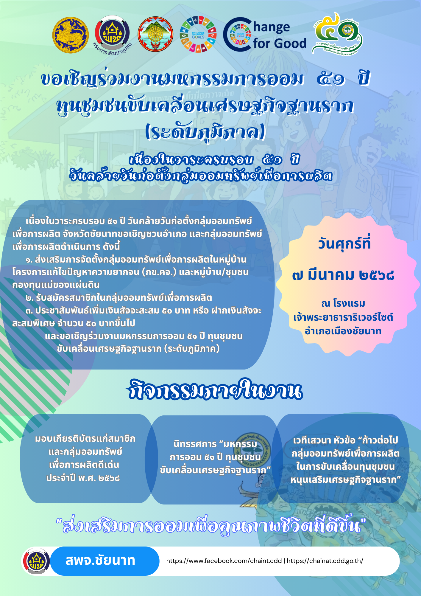 🕊📌พช.ชัยนาท ขอเชิญร่วมมหกรรมการออม 51 ปี ทุนชุมชนขับเคลื่อนเศรษฐกิจฐานราก (ระดับภูมิภาค) จังหวัดชัยนาท เนื่องในวันคล้ายวันก่อตั้งกลุ่มออมทรัพย์เพื่อการผลิต ครบรอบ