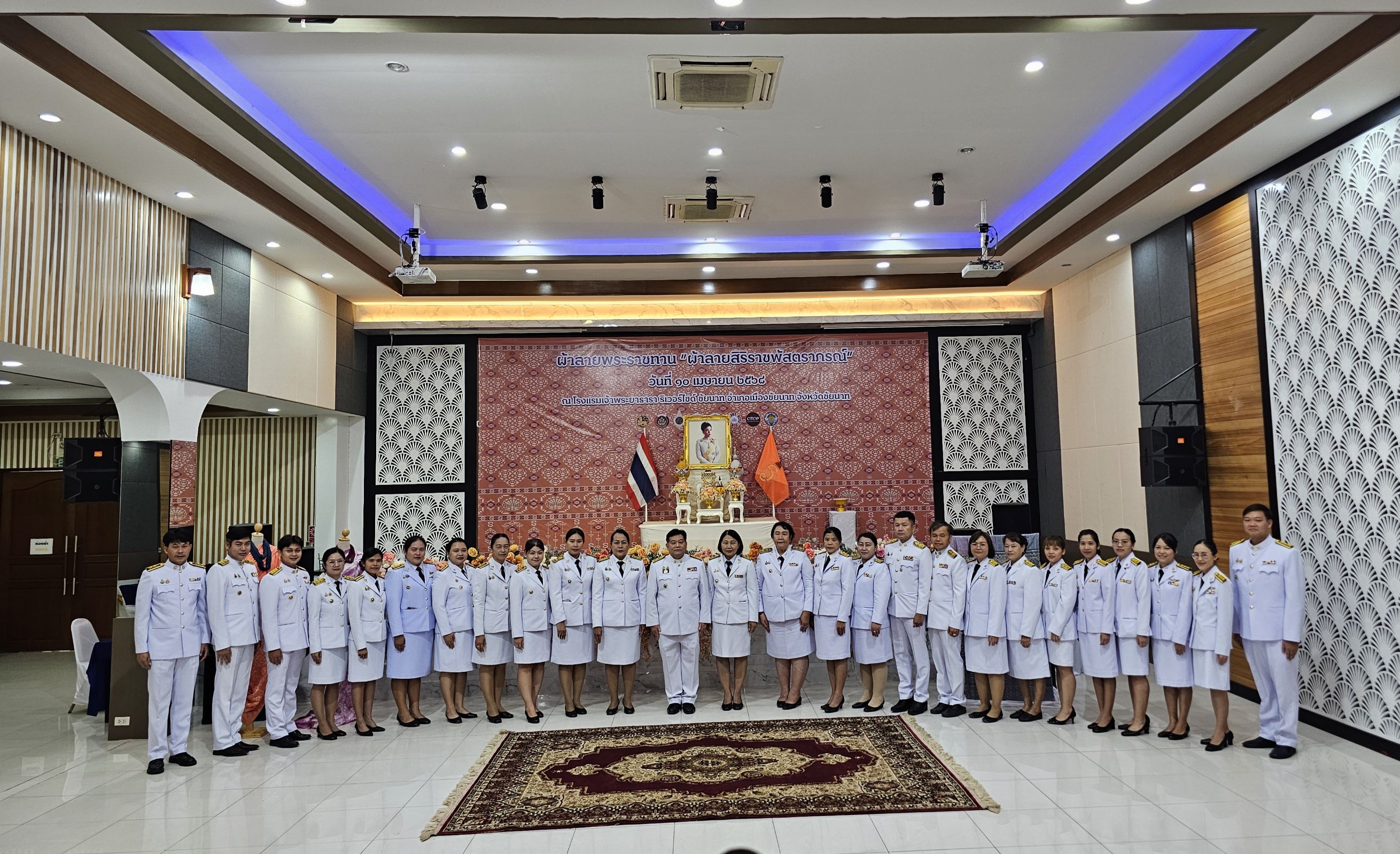 💞🎯>>จังหวัดชัยนาท จัดพิธีมอบแบบลายผ้าพระราชทาน “ผ้าลายสิริราชพัสตราภรณ์” ให้แก่นายอำเภอทุกอำเภอ หัวหน้าส่วนราชการระดับจังหวัด และผู้ผลิต ผู้ประกอบการ ประเภทผ้า เครื่องแต่งกาย ช่างทอผ้าและช่างหัตถกรรมในจังหวัดชัยนาท เพื่อน้อมนําแนวพระดําริของสมเด็จพระเจ้าลูกเธอ เจ้าฟ้าสิริวัณณวรี นารีรัตนราชกัญญาในการส่งเสริมอนุรักษ์ภูมิปัญญาผ้าไทยให้ทันสมัยสู่สากล และให้ช่างทอผ้าและช่างหัตถกรรมไทยภายในจังหวัดชัยนาท นำลวดลายอันทรงคุณค่ามาประยุกต์ใช้ในการสร้างสรรค์ผืนผ้าและผลิตภัณฑ์หัตถกรรมไทย โดยผสมผสานกับลวดลายดั้งเดิมที่เป็นเอกลักษณ์ของจังหวัด อันเป็นการฟื้นฟูและสืบทอดภูมิปัญญาดั้งเดิม ควบคู่ไปกับการยกระดับมาตรฐานและพัฒนาศักยภาพงานหัตถศิลป์ไทยให้ก้าวไกลในทุกมิติ ณ โรงแรมเจ้าพระยาธารา ริเวอร์ไซด์ ชัยนาท อำเภอเมืองชัยนาท จังหวัดชัยนาท