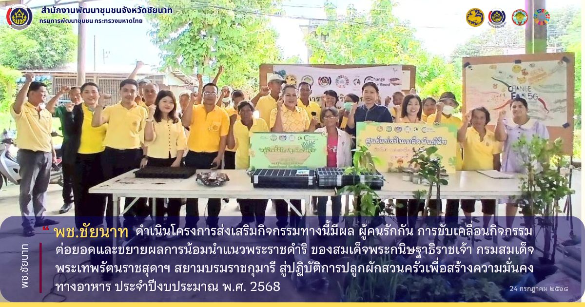 🕊📌พช.ชัยนาท ดำเนินโครงการส่งเสริมกิจกรรมทางนี้มีผล ผู้คนรักกัน การขับเคลื่อนกิจกรรมต่อยอดและขยายผลการน้อมนำแนวพระราชดำริ ของสมเด็จพระกนิษฐาธิราชเจ้า กรมสมเด็จพระเทพรัตนราชสุดาฯ สยามบรมราชกุมารี สู่ปฏิบัติการปลูกผักสวนครัวเพื่อสร้างความมั่นคงทางอาหาร ประจำปีงบประมาณ พ.ศ. 2568