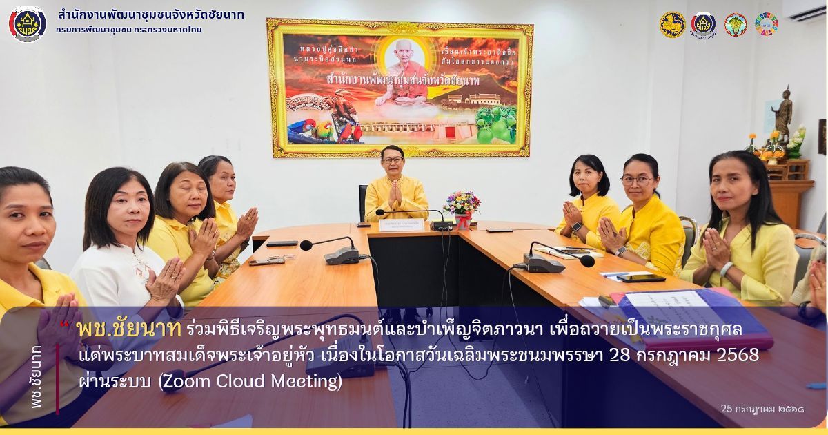 🕊📌พช.ชัยนาท ร่วมพิธีเจริญพระพุทธมนต์และบำเพ็ญจิตภาวนา เพื่อถวายเป็นพระราชกุศลแด่พระบาทสมเด็จพระเจ้าอยู่หัว เนื่องในโอกาสวันเฉลิมพระชนมพรรษา 28 กรกฎาคม 2568 ผ่านระบบ (Zoom Cloud Meeting)