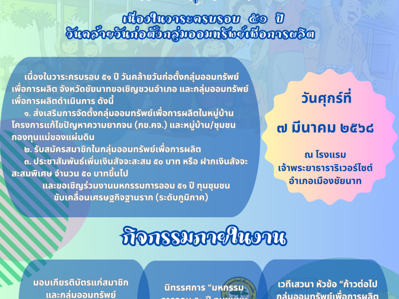 🕊📌พช.ชัยนาท ขอเชิญร่วมมหกรรมการออม 51 ปี ทุนชุมชนขับเคลื่อนเศรษฐกิจฐานราก (ระดับภูมิภาค) จังหวัดชัยนาท เนื่องในวันคล้ายวันก่อตั้งกลุ่มออมทรัพย์เพื่อการผลิต ครบรอบ